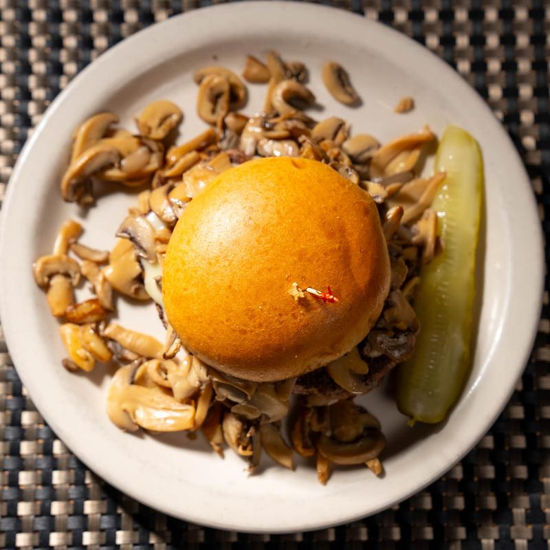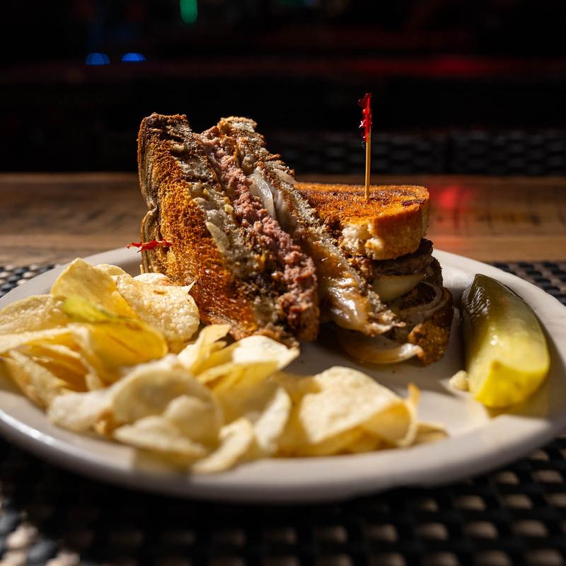 Each burger includes a half-pound patty • Add a Fried Egg +$2.50 • Served with chips • Upgrade: Fries or Tots +$ 2.99 | Bacon +$1.75 | Tomato +$0.50